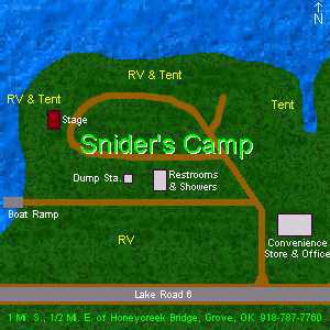 Snider's Camp is 1 Mile South and 1/2 Mile East of Honeycreek Bridge, Grove, OK 918-787-7760